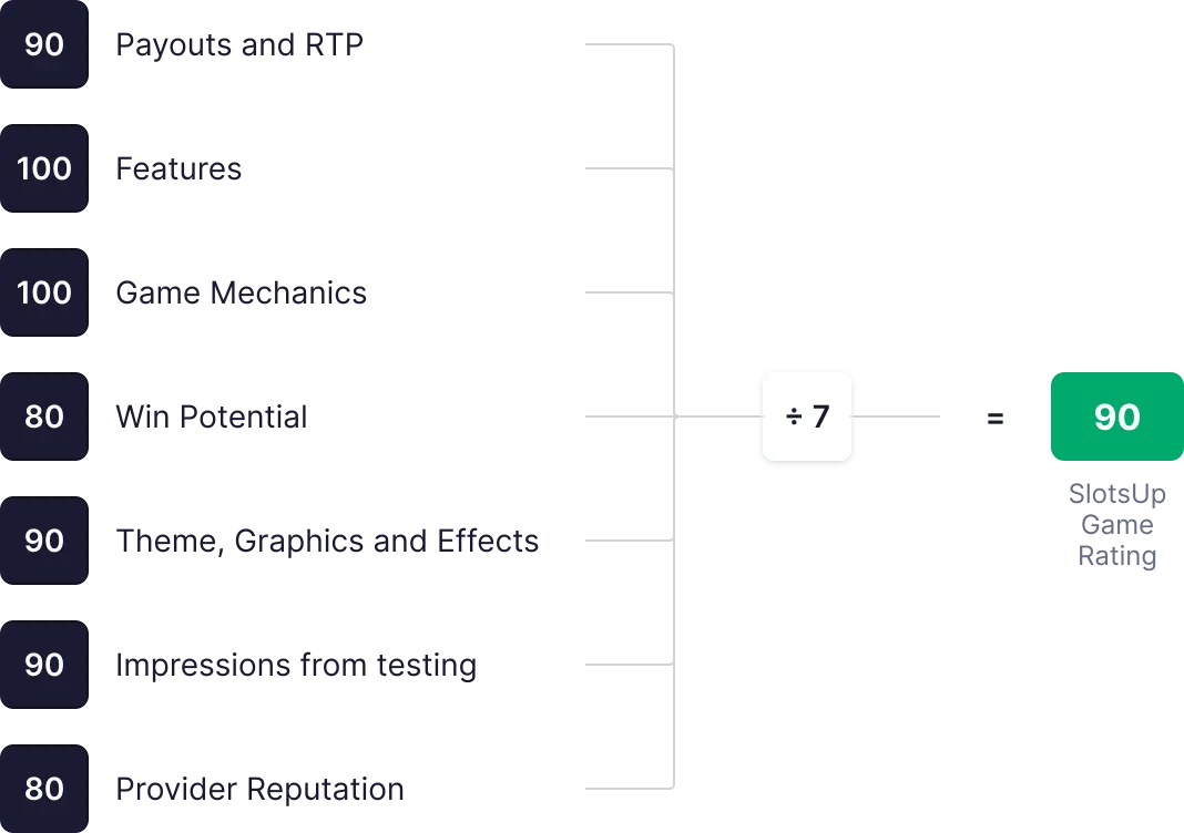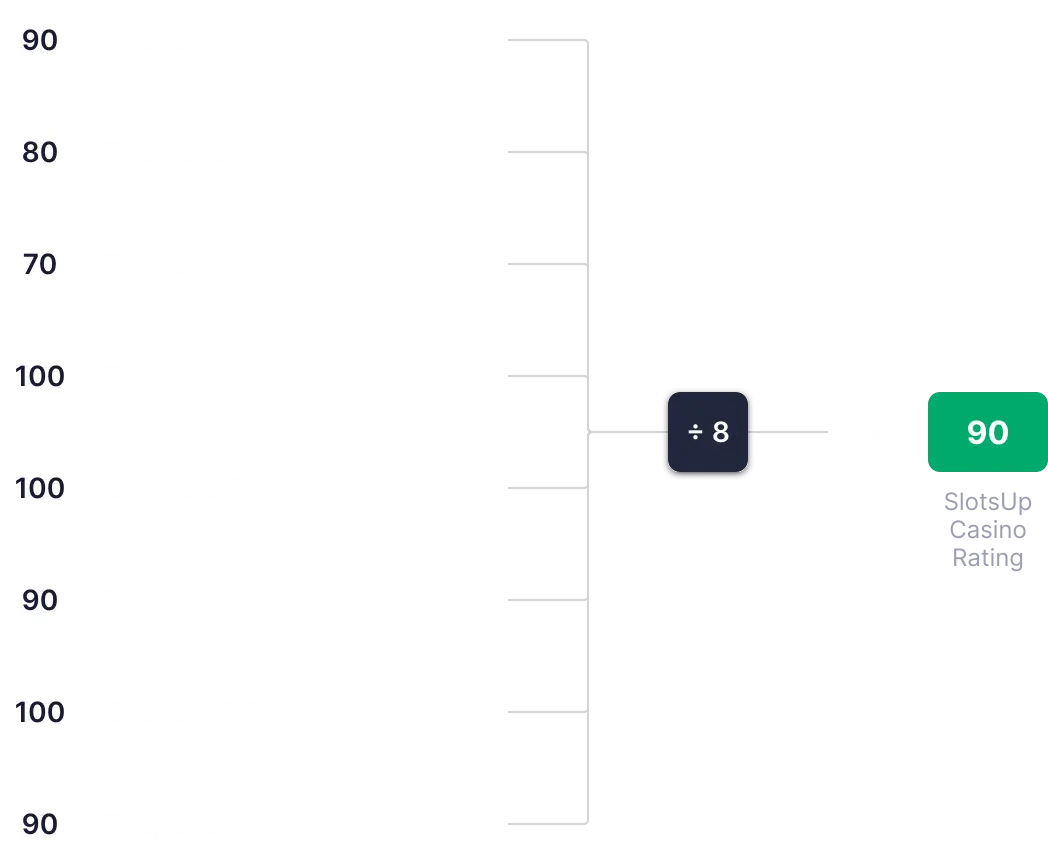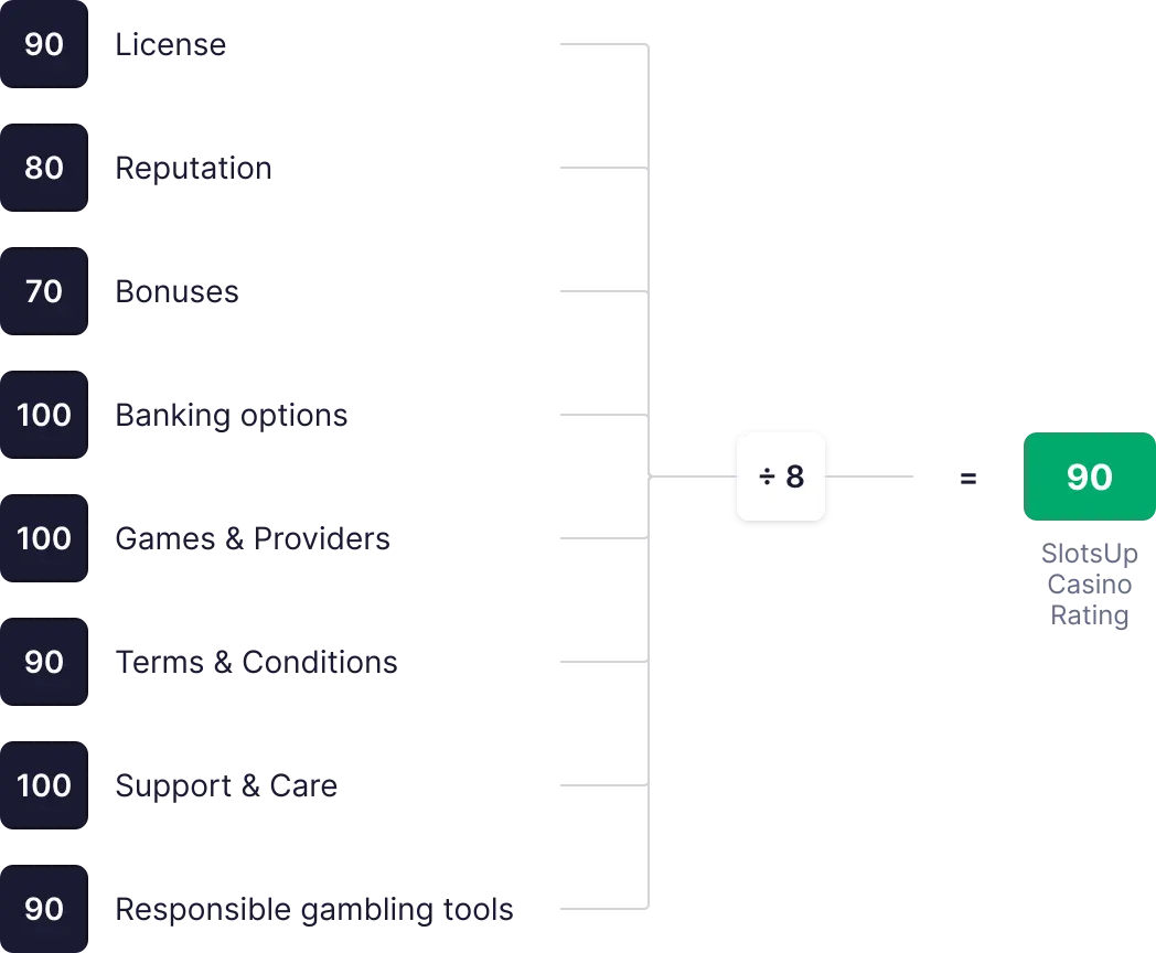 SlotsUp Kasiino Hinne arvutatakse kaheksa põhikriteeriumi põhjal, igaüht hinnates skaalal 0 kuni 100. Hinded liidetakse, arvutatakse keskmine ja sellest moodustatakse lõplik üldhinne.